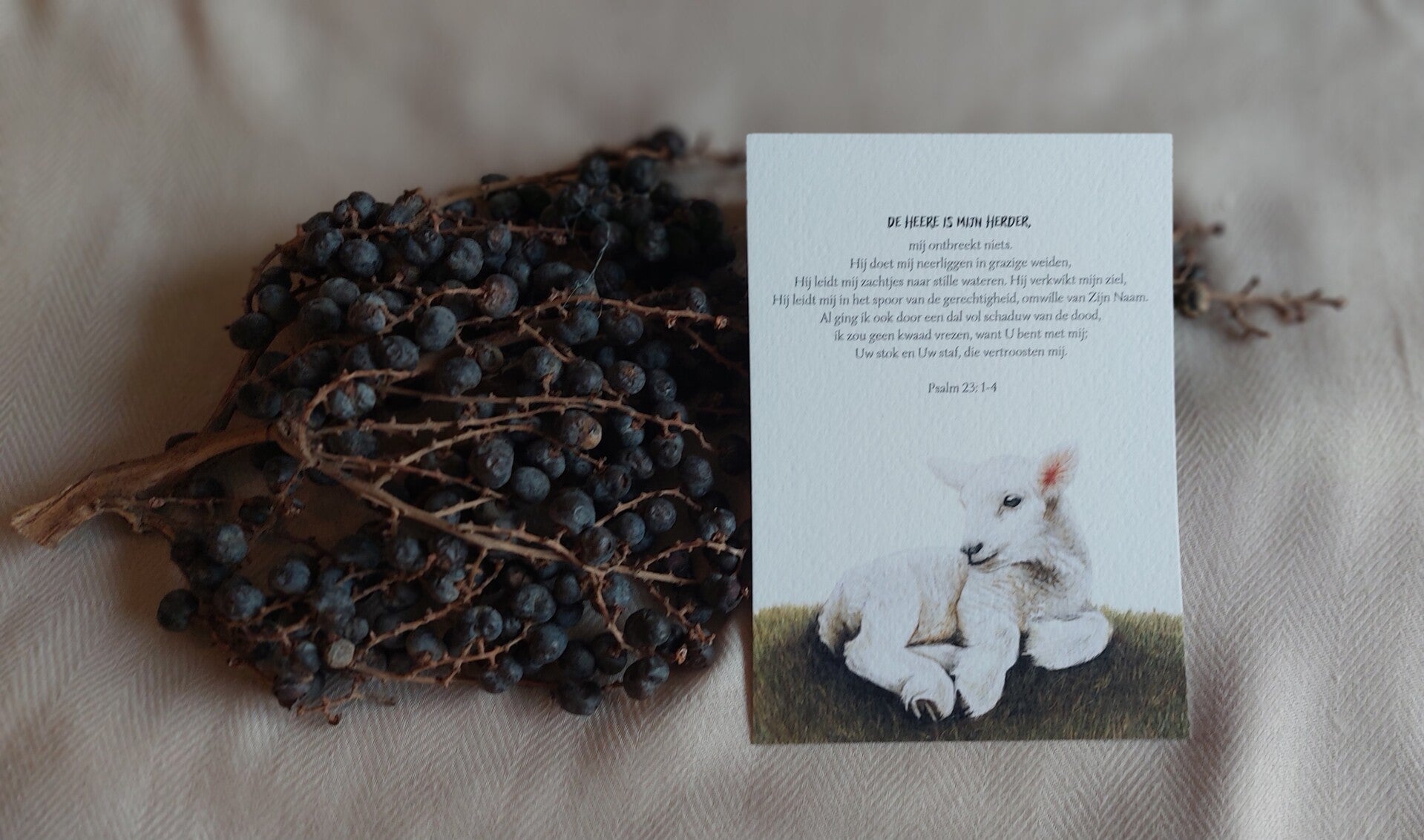 De HEERE is mijn Herder, mij ontbreekt niets. Hij doet mij neerliggen in grazige weiden, Hij leidt mij zachtjes naar stille wateren. Hij verkwikt mijn ziel, Hij leidt mij in het spoor van de gerechtigheid, omwille van Zijn Naam. Al ging ik ook door een dal vol schaduw van de dood, ik zou geen kwaad vrezen, want U bent met mij: Uw stok en Uw staf, die vertroosten mij.